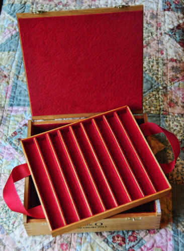 | Here's another Oliva box, deeper than the first one, which led to a much bigger project: a two level storage box. I made the pen compartments using strips of wood padded on both sides with felt. A red ribbon handle makes lifting the top tray out an easy and safe process. | ![]() |