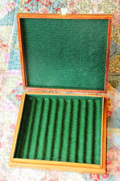 This Oliva box has a felt covered tray and felt lined sides and lid, plus sturdy hinges and double latches. It holds ten pens and measures 8 1/2" wide by 8" by 2". Cost: $20 plus shipping - SOLD. |